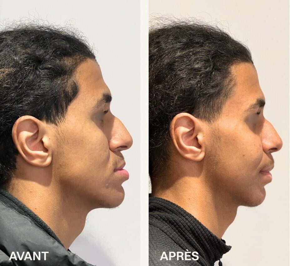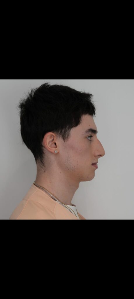 - Profile imbalance (nose appears larger because the chin is small)